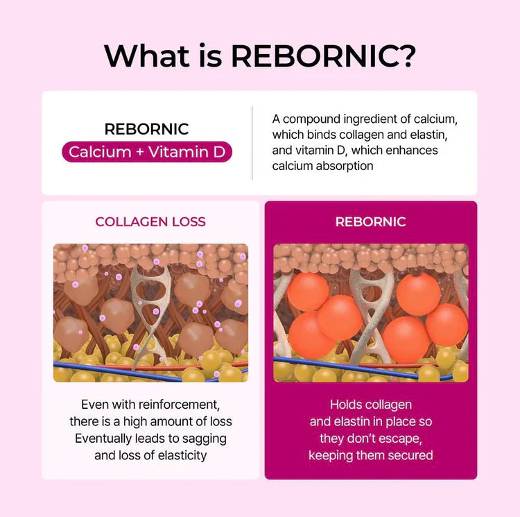 Rebornic Calcium complex boosts elasticity, helping lift sagging eyelids and refresh droopy eyes in minutes.